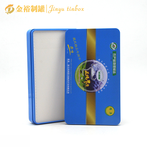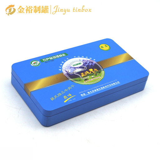 【簡介】此款長方形食品鐵盒是用來裝牦牛肉的,采用四色印刷工藝,天藍色的外表,代表著綠色有機,盒子內部搭配紙質內襯,起到二次密封的效果,也更加方便衛生。這樣一款牦牛肉鐵盒,光看外表就充滿食欲,里面的牦牛肉味道肯定也很贊!