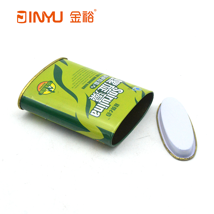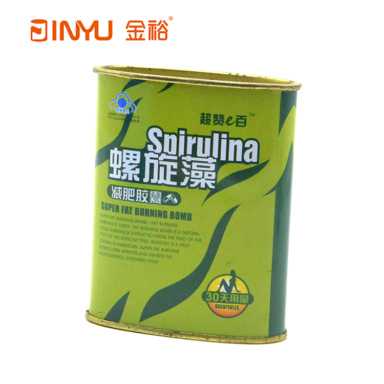 【簡介】此款鐵盒是用來裝螺旋藻減肥膠囊的,橢圓形的造型,封底結(jié)構(gòu),內(nèi)塞蓋的結(jié)構(gòu),小巧精美。