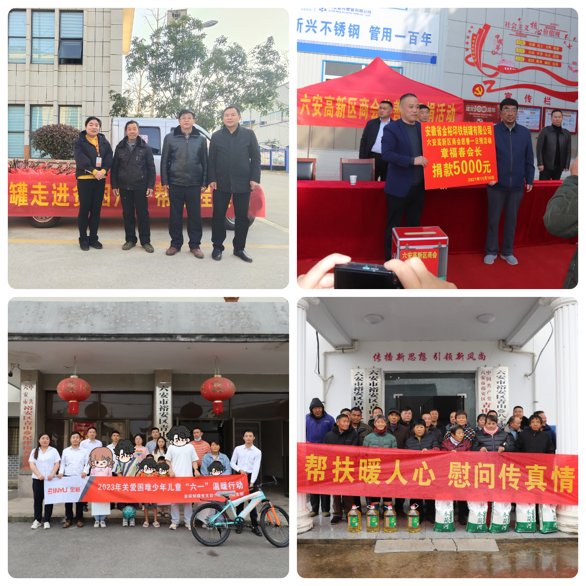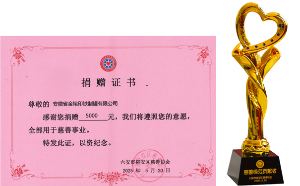 作為從裕安這片熱土上成長起來的本土企業,金裕制罐深知企業的發展離不開家鄉人民的支持與社會各界的關愛。“感恩社會,回饋桑梓”早已融入我們的血脈,成為企業堅定不移的核心價值理念。多年來,我們始終將慈善公益視為己任,用點滴行動傳遞溫暖: