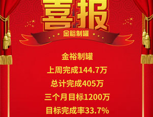 今天是2018年7月31日,牛商爭霸賽的第一階段即將結束,6月25日的啟動大會還歷歷在目,時間卻已悄然掠過。這一個月,金裕制罐總計完成了405萬銷售額,而三個月的總目標是1200萬,目標完成率33.7%,金裕制罐超額完成了第一階段的計劃。按照目前發展勢頭,拿下1200萬...